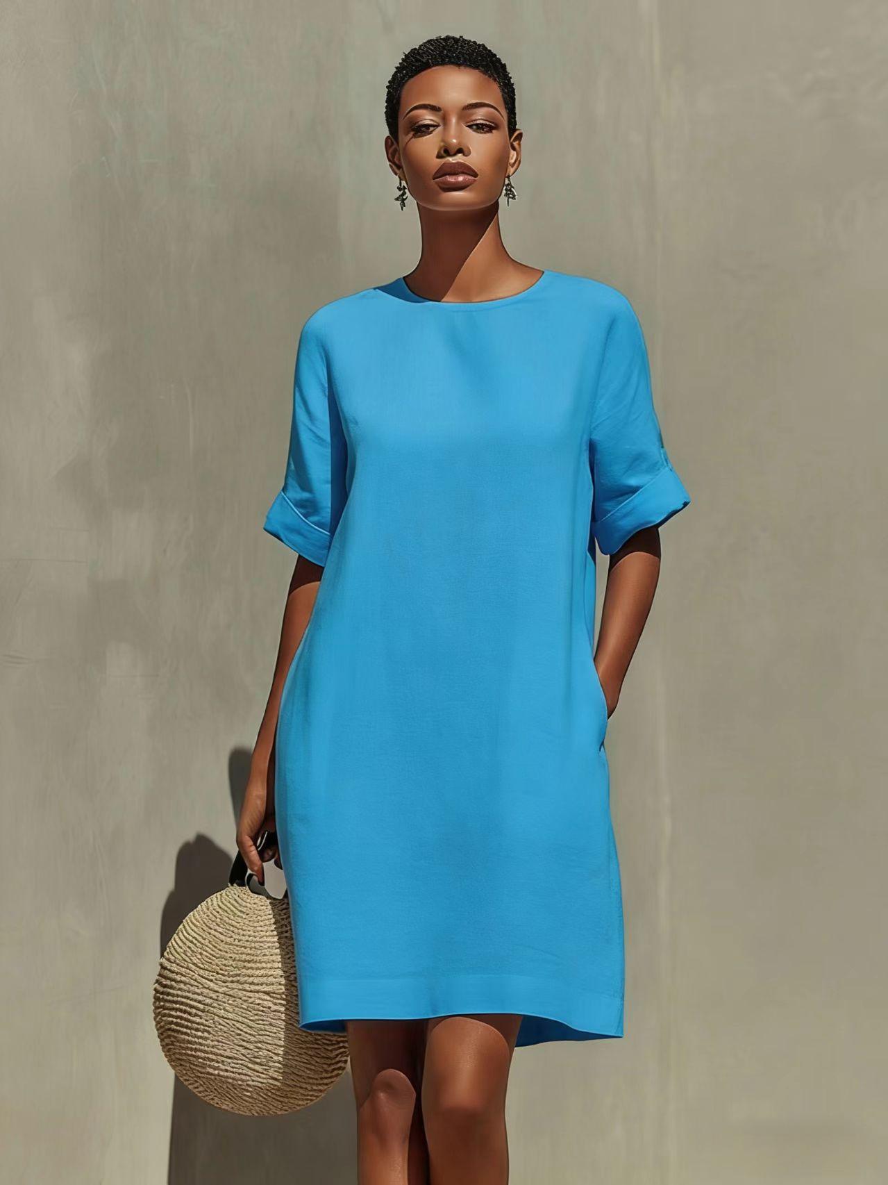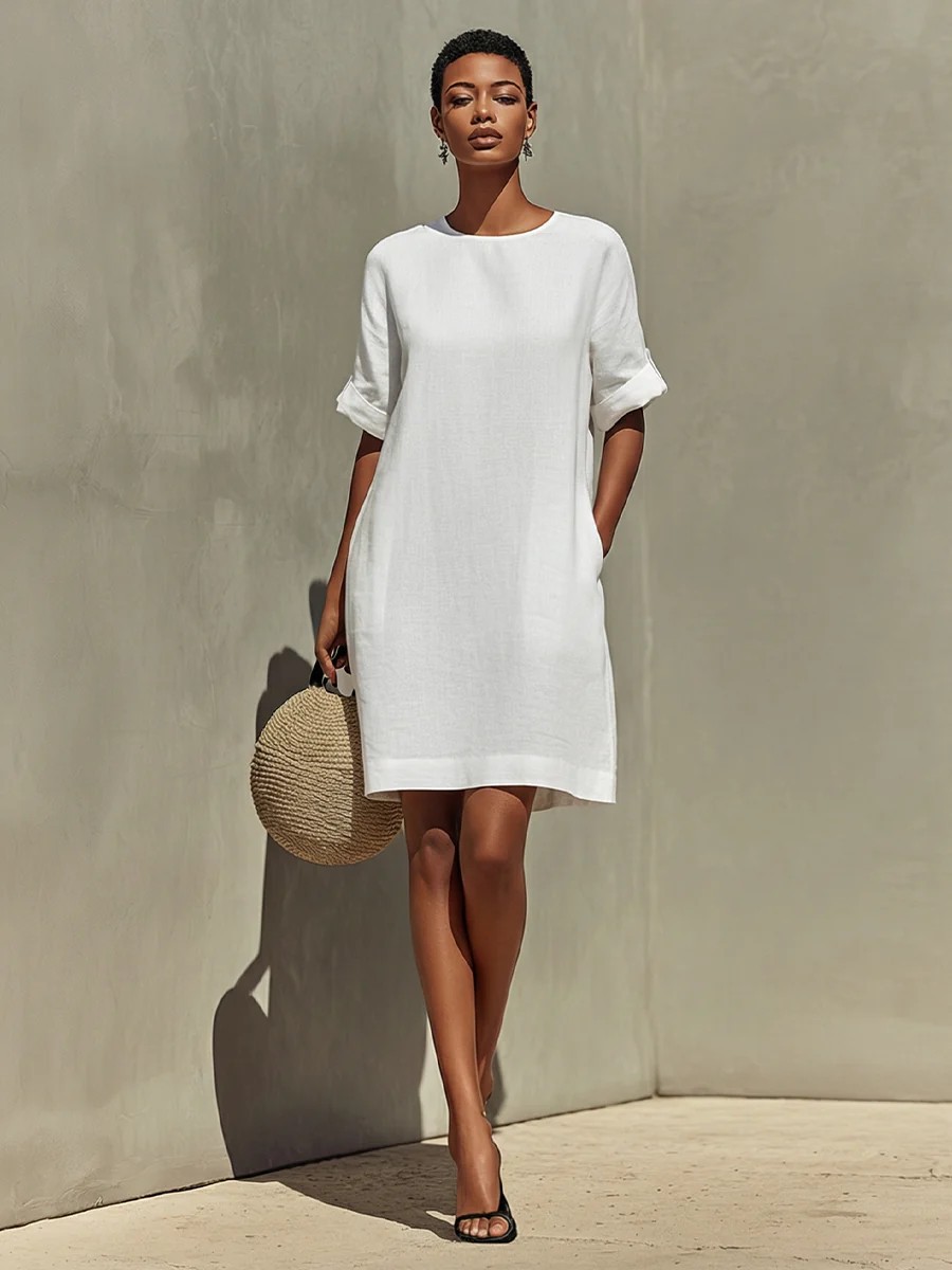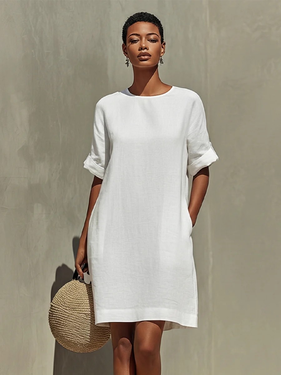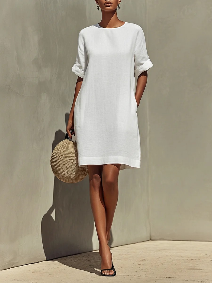 Round-neck Dress With Rolled-up Cuffs